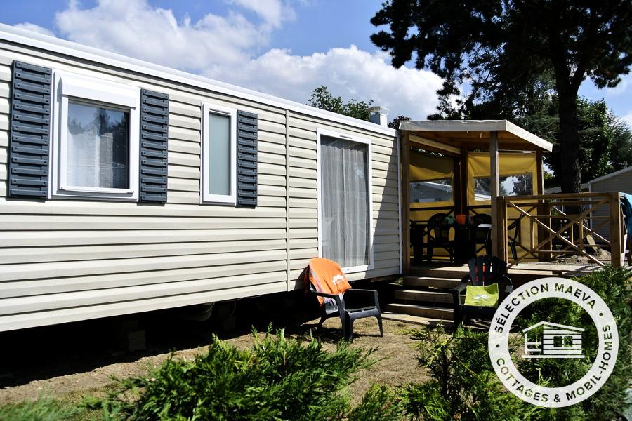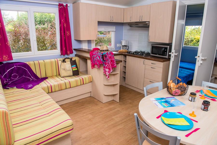 Mobil Home 4 pièces pour 6/8 personnes de 37m² environ, composé d'un coin salon avec une banquette convertible, d'un coin cuisine équipé, d'une chambre avec 1 lit double (140x190), d'une chambre avec 2 lits simples (80x190), d'une salle de douche, de WC séparés et d'une terrasse en bois semi-couverte.