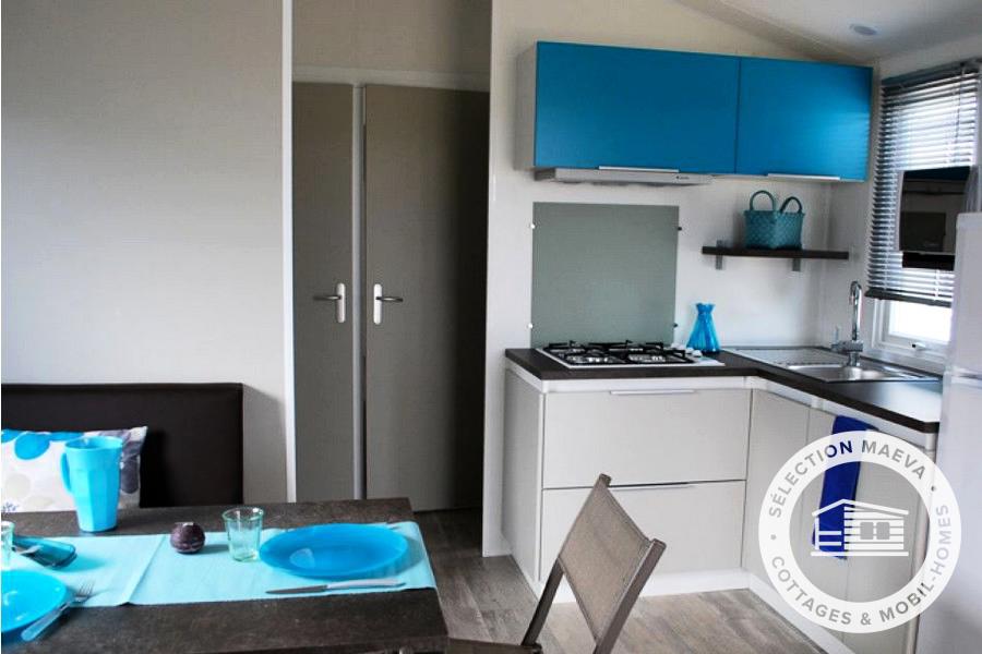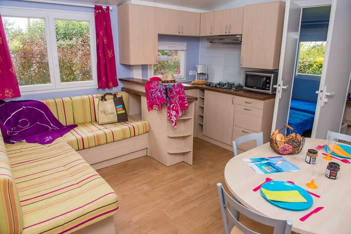 Le Mobil Home comprend un coin salon avec télévision et chauffage, un coin cuisine avec réfrigérateur, micro-ondes, lave-vaisselle, cafetière électrique, plaque de cuisson gaz, bouilloire, grille-pain, ustensiles de cuisine nécessaires et vaisselle adaptée au nombre de personnes dans le logement.