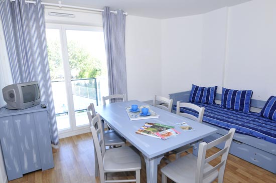 Appartement de 3 pièces pour 6 personnes de 40 à 44m², composé d'un séjour avec une banquette-lit gigogne pour deux personnes, de deux chambres (1 double + 1 avec deux lits simples), d'une cuisine entièrement équipée, d'une salle de bain et d'un WC. Balcon ou terrasse. Certains appartements sont en mezzanine.