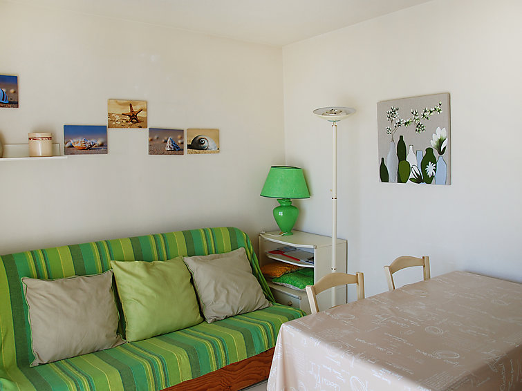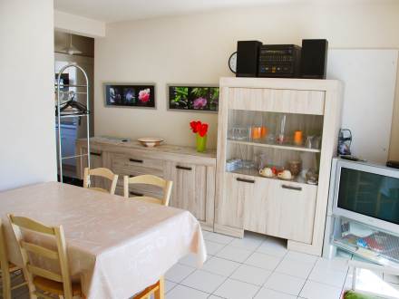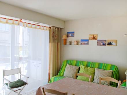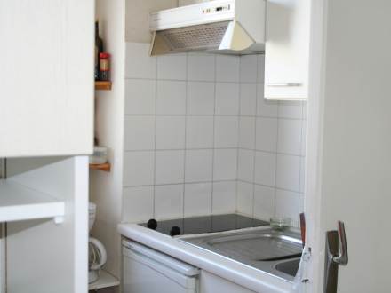 Apt 2 pièces 32 m2 au 1er étage: séjour/salle à manger avec 1 divan-lit double, TV et chaîne stéréo. 1 petite chambre avec porte coulissante avec 1 grand-lit. Coin cuisine (2 plaques de cuisson, mini-four). Salle de bains, WC séparé. Chauffage électrique. Balcon 5 m2. Meubles de terrasse. Le séjour donne sur cour, la chambre sur rue. Congélateur dans le séjour.