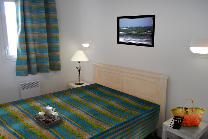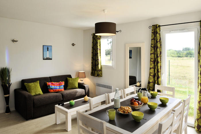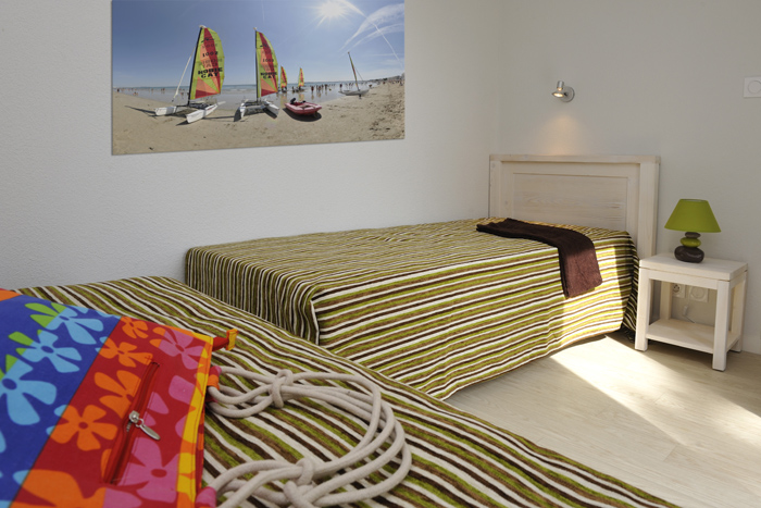 3 pièces 6 personnes de 48m², comprenant un séjour avec un canapé lit, une chambre avec un lit double, une chambre avec 2 lits simples ou superposés.