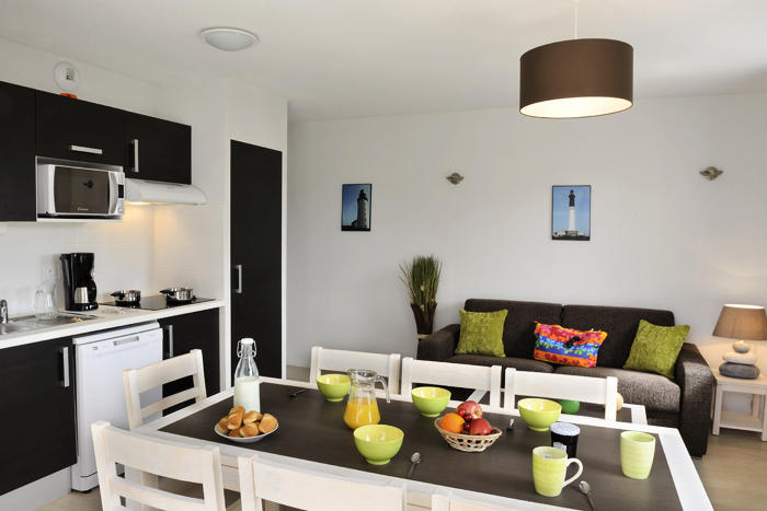 L'appartement dispose d'une cuisine équipée de plaques électriques, d'un micro-ondes, d'un lave vaisselle, d'un réfrigérateur, d'un cafetière, et d'un grille pain.