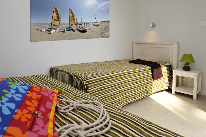 Appartement 2 pièces cabine 6 personnes de 43m², comprenant un séjour avec un canapé lit, une chambre avec un lit double, une chambre avec 2 lits simples ou superposés, une cuisine équipée et une salle de bains.