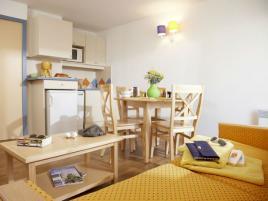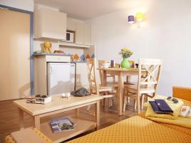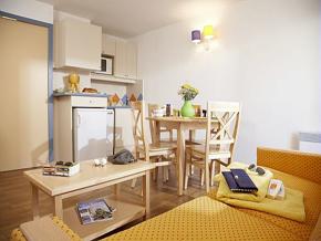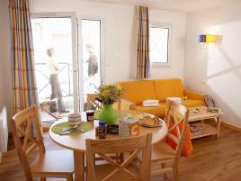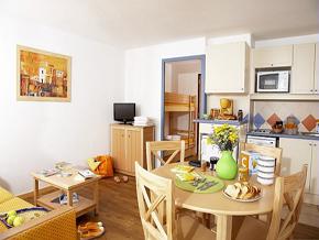 Superficie d'environ 25 m². Séjour avec canapé-lit. Coin montagne avec 2 lits superposés. Kitchenette avec cafetière, four, lave-vaisselle, 2 plaques de cuisson, réfrigérateur. Salle de bains avec baignoire ou douche, WC. Loggia. Les couchages en hauteur ne conviennent pas aux enfants de moins de 6 ans.