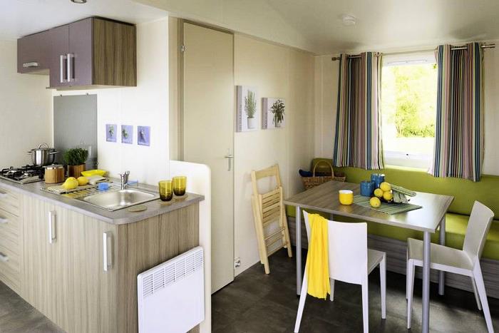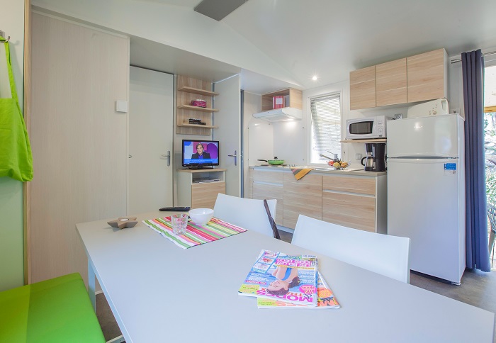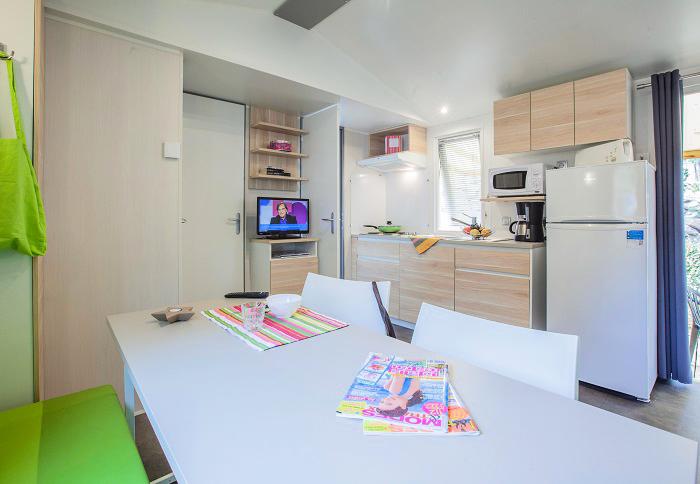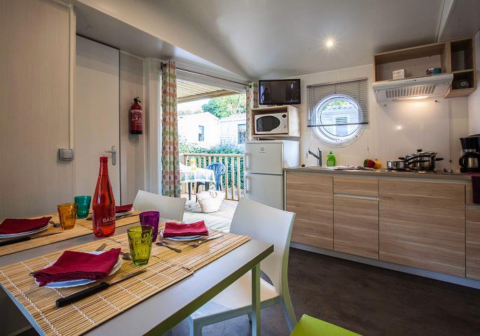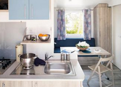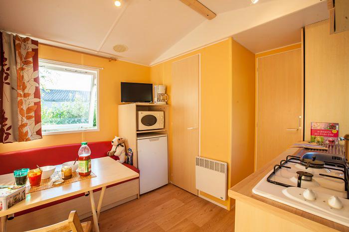 Le mobil-home comprend un coin cuisine avec une plaque de cuisson électrique ou au gaz, un réfrigérateur, un micro-ondes, une cafetière électrique, les ustensiles de cuisine et vaisselle. La terrasse dispose d'un salon de jardin.