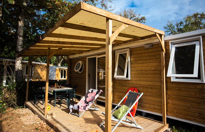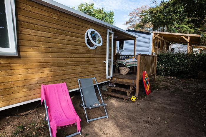 Mobil Home de 25m² pouvant accueillir jusqu'à 6 personnes, composé d'une pièce de vie avec banquette convertible en lit 2 personnes, d'une kitchenette équipée, d'une chambre avec un lit double, d'une chambre avec deux lits simples, d'une salle de bain avec douche et WC séparés. Il comprend également une terrasse en bois semi-couverte.