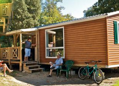 Mobil Home de 25m² pouvant accueillir jusqu'à 6 personnes, composé d'une pièce de vie avec banquette convertible en lit 2 personnes, d'une kitchenette équipée, d'une chambre avec un lit double, d'une chambre avec deux lits simples, d'une salle de bain avec douche et WC séparés. Il comprend également une terrasse en bois semi-couverte. A noter: possibilité d'ajouter un lit bébé et de louer une télévision.