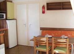 Le mobil home comprend une kitchenette équipée avec 4 feux gaz, une petit réfrigérateur, un micro-ondes et une cafetière électrique. La terrasse dispose d'un parasol et un salon de jardin.