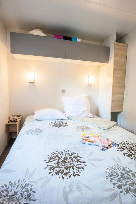 Mobil-home 4 pièces 6/8 personnes de 31m² composé d'un séjour avec une banquette convertible en couchage d'appoint pour deux personnes (130x190), d'un coin repas, d'une kitchenette équipée, d'une chambre avec un lit double (140x190), de deux autres chambres avec deux lits simples chacune (80x190), d'une salle de douche avec WC séparés. A noter: possibilité d'ajouter un lit bébé et de louer une télévision.