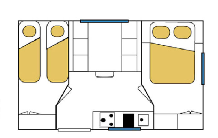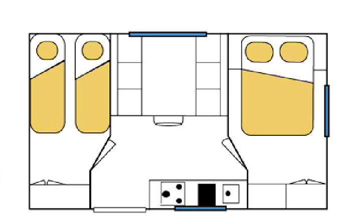 Mobil home de 16m² pour 4 personnes, composé d'une kitchenette équipée, d'un séjour avec un coin repas, d'une chambre avec un lit double, d'une chambre avec 2 lits simples et une terrasse couverte. A noter : ce mobil home ne possède pas de sanitaires. Accès libre au bloc sanitaires du camping.
