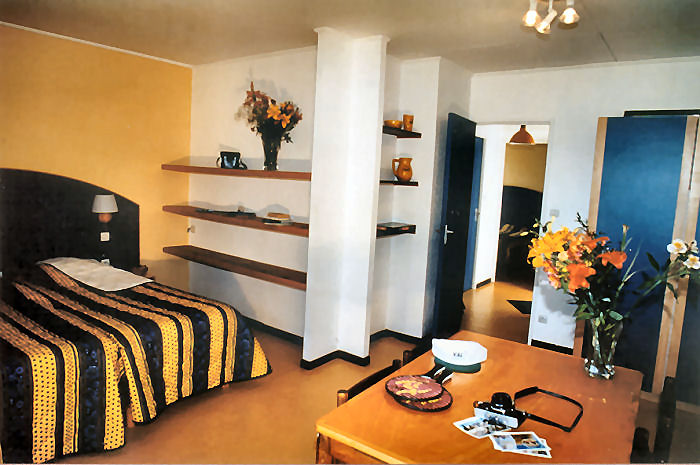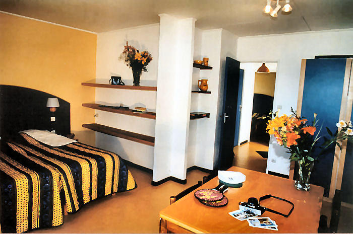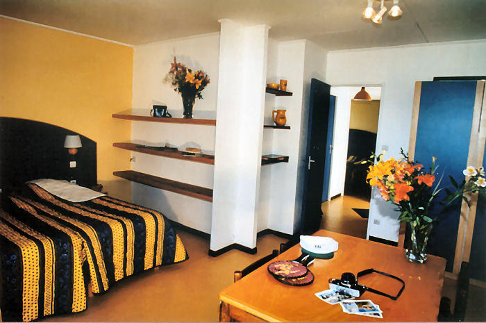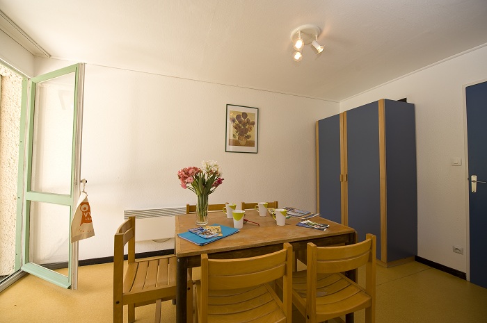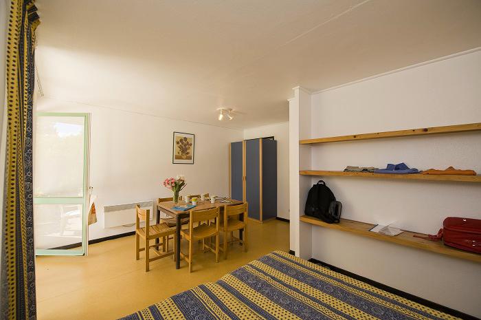 Appartement de 40m² pour 5 personnes composé d'un séjour-chambre avec 2 lits, 1 chambre cabine avec 3 lits. Kitchenette équipée, salle d’eau (douche, lavabo), WC indépendants et d’une terrasse avec mobilier de jardin. A noter : logement en demi-pension ou pension complète. Ajout de lit bébé possible : sur demande auprès du service réservations.