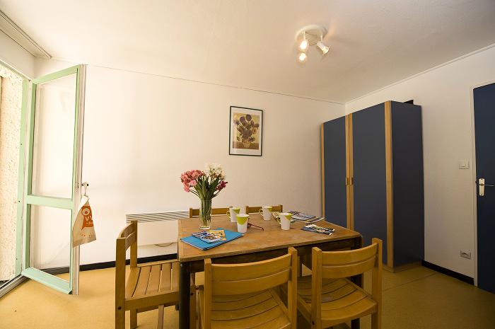 Appartement de 28m² pour 4 personnes composé d'un séjour-chambre avec 2 lits, 1 chambre cabine avec 2 lits superposés. Kitchenette équipée, salle d?eau (douche, lavabo), WC indépendants et d?une terrasse avec mobilier de jardin.