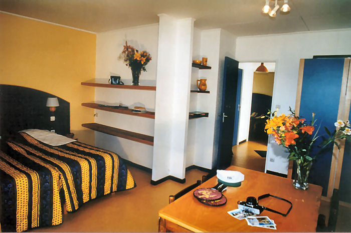 Appartement de 28m² pour 4 personnes composé d'un séjour-chambre avec 2 lits, 1 chambre cabine avec 2 lits superposés. Kitchenette équipée, salle d?eau (douche, lavabo), WC indépendants et d?une terrasse avec mobilier de jardin.A noter : logement en demi-pension ou pension complète.