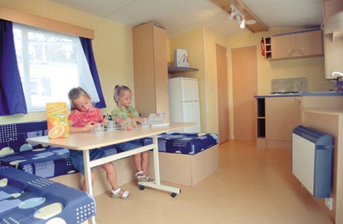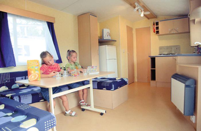 Mobil Home 3 pièces 5/6 personnes de 25m² composé d'un séjour avec une banquette lit pour 2 personnes, d'une chambre avec 1 lit double, d'une chambre avec 2 lits superposés ou un lit double et 1 lit superposé, d'un coin cuisine équipé, d'une salle d'eau avec une cabine de douche et des WC indépendants. Terrasse en bois.Ce Mobil home convient pour 6 adultes et un enfant (possibilité de lit enfant supplémentaire).