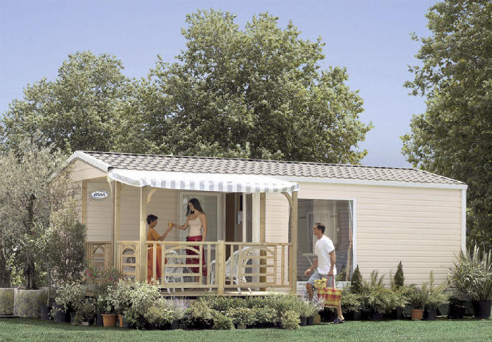 Mobil Home pour 6 personnes de 30m² composé d'un salon, un coin cuisine, une chambre avec 1 lit double pour 2 personne et deux chambres avec 2 lits simples chacune, une salle de bains et wc. Terrasse intégrée de 10m²