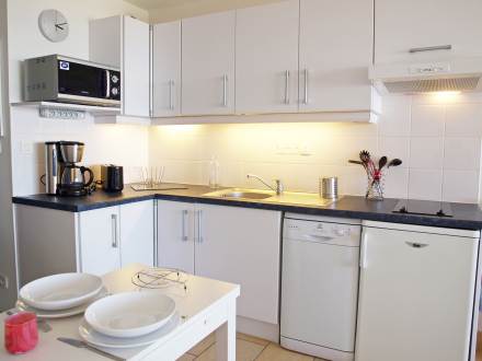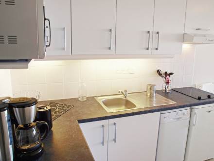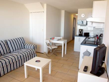 Studio 25 m2 au 3ème étage: entrée avec 1 x 2 lits superposés (90 cm). Séjour/salle à manger avec 1 divan-lit double et TV. Sortie sur le balcon. Coin cuisine (lave-vaisselle, plaque vitro céramique, four micro-ondes, gril). Douche/WC. Chauffage électrique. Balcon 8 m2. Mobilier de balcon. Vue sur la mer. A disposition: lave-linge. Maximum 1 animal/ chien autorisé.