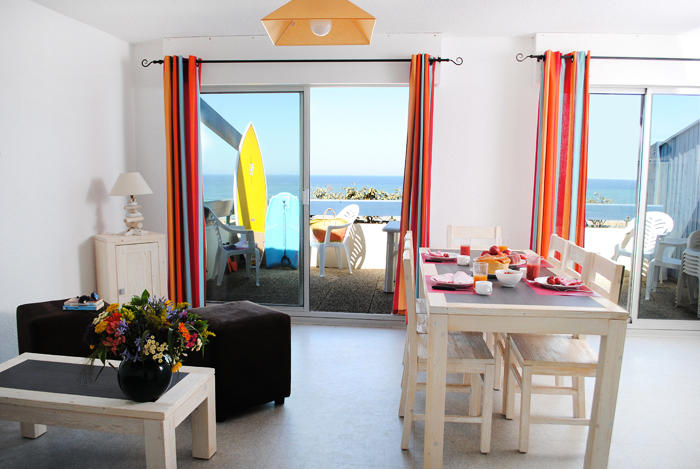 Appartement pour 6 personnes de 48m² composé d'un séjour avec un canapé-lit clic clac pour deux personnes, d'un coin cuisine, d'un coin repas, de 2 chambres avec 1 lit double ou 2 lits simples, d'une salle de bain et de WC séparés. Terrasse ou balcon.