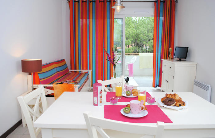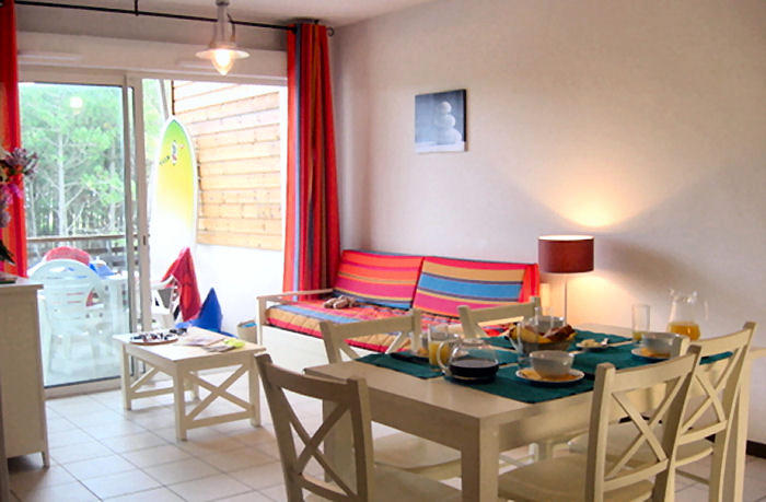 Appartement de 3 pièces pour 6 personnes de 45m² composé d'un séjour avec canapé-lit gigogne pour 2 personnes, d'un coin repas, d'une chambre avec 1 lit double, d'une chambre avec 2 lits simples, d'une salle de bains avec baignoire et WC séparé. Balcon ou terrasse.A noter : 2 logements sont adaptés pour les personnes à mobilité réduite ( WC dans salle de bains).