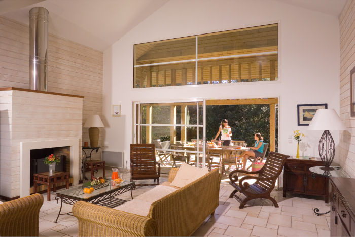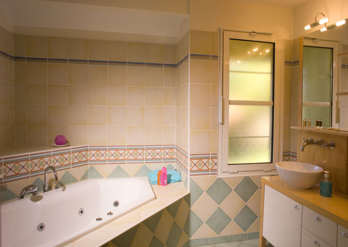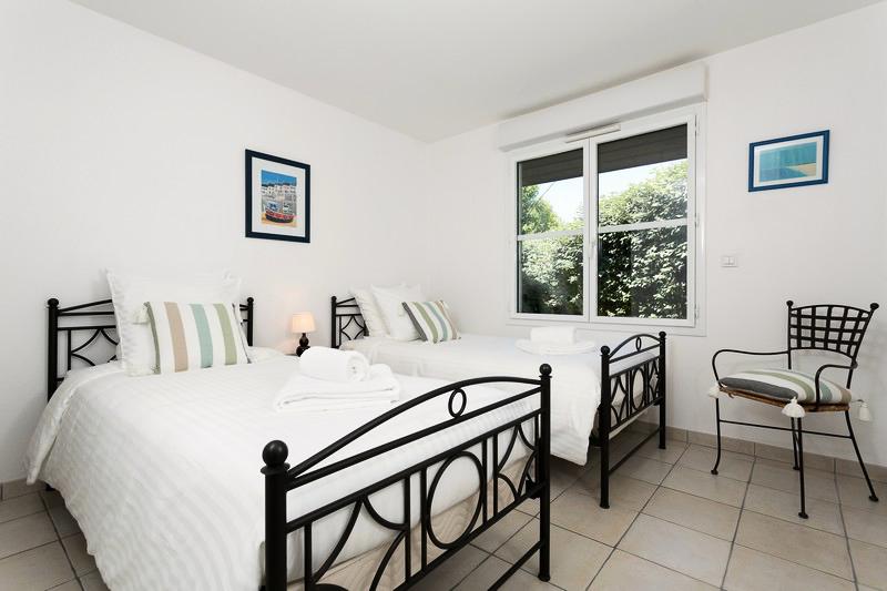 Villa de 4 Pièces pour 6 à 8 Personnes de 90m² composée d'un séjour, d'une chambre principale avec grand lit, d'une salle de bains avec baignoire balnéo (pour la plupart) et WC, de deux chambres avec soit un lit double, soit deux lits simples, d'une salle de douche et WC séparés et d'une cuisine équipée.