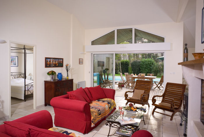 Villa de 6 pièces pour 10 à 12 personnes de 145m², composée d'un séjour spacieux avec un canapé lit pour deux personnes, de 4 chambres avec chacune un lit double ou deux lits simples, d'une mezzanine avec un lit double ou deux lits simples, d'une salle de bain attenante à la chambre principale avec baignoire balnéo pour la plupart, de deux salles de douche de toilettes et d'une cuisine équipée.