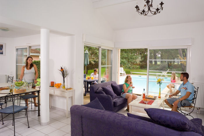 Villa de 3 pièces pour 4 à 6 personnes de 91m² composée d'un grand séjour avec un canapé lit pour deux personnes, de deux chambres avec un lit double ou deux lits simples chacune, d'une salle de bain attenante à la chambre principale avec baignoire balnéo pour la plupart, d'une salle de douche supplémentaire, de toilettes et d'une cuisine équipée.