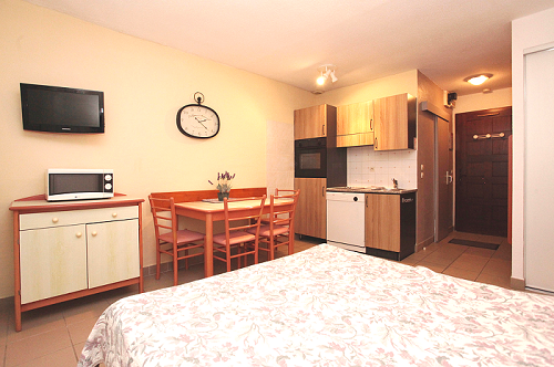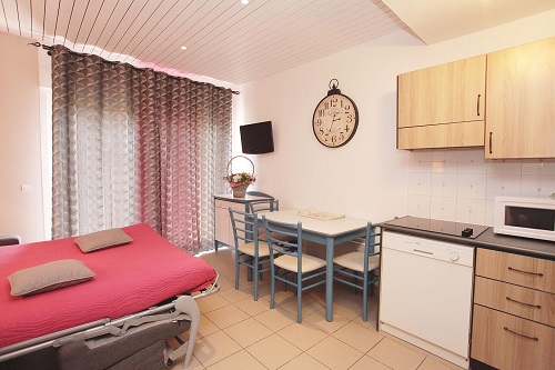 Un coin salon équipé avec télévision à écran plat.La kitchenette est équipée d'une cuisinière, un lave-vaisselle, hotte aspirante, réfrigérateur-congélateur, 4 plaques de cuisson, d'une cafetière ainsi que tous les ustensiles de cuisine et vaisselle. Le linge de lit et de toilette est fourni. (four micro-ondes sur demande)