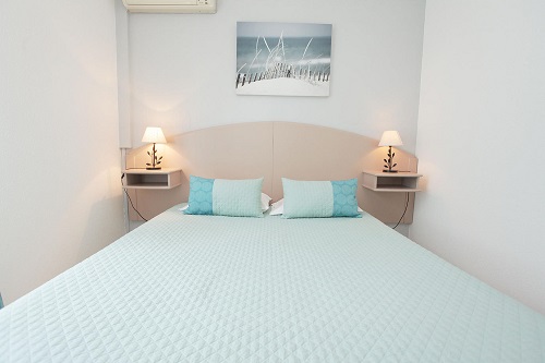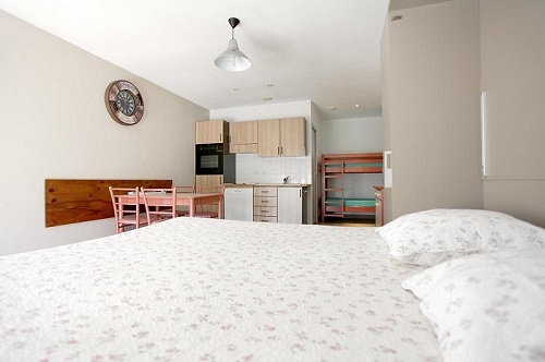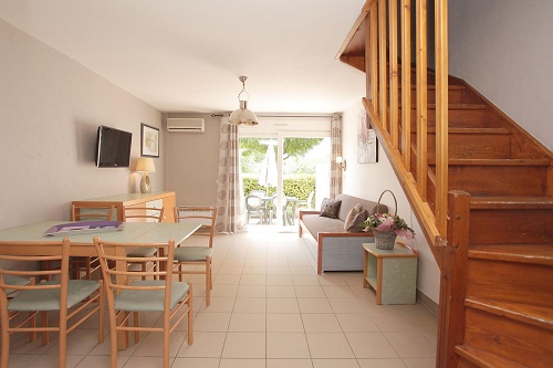 Suite familiale de 55m² pour 6 personnes composé d'un séjour avec un canapé convertible en deux lits simples, une chambre avec lit double et une chambre avec deux lits jumeaux simples, d'une kitchenette équipée, d'une salle de bain avec baignoire et WC intégrés et d'une terrasse privative.