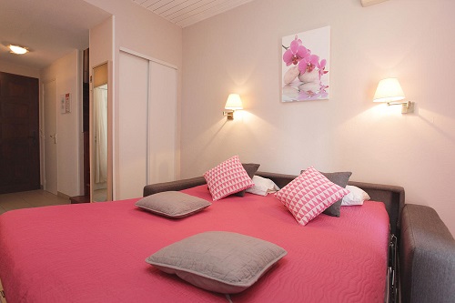 Studio de 25m² pour 2 personnes composé d'un séjour avec un canapé convertible pour deux personnes, d'une kitchenette équipée, d'une salle de bain avec baignoire et WC intégrés et d'un balcon.