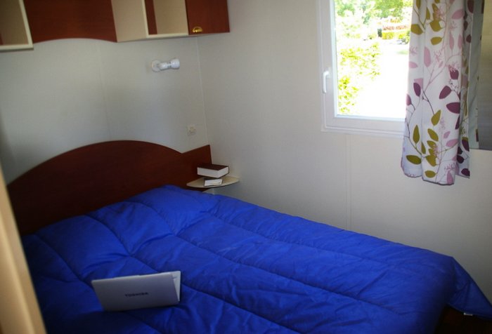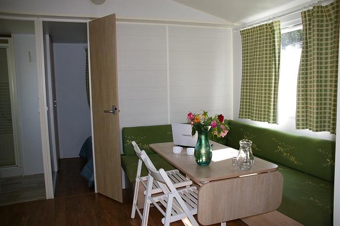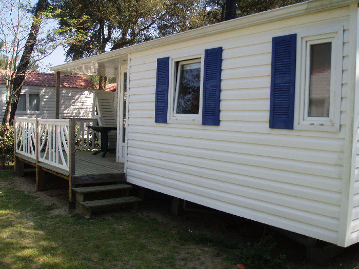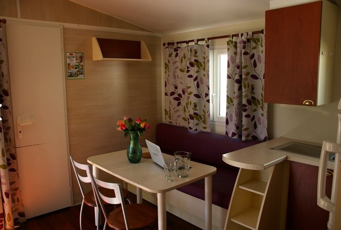 Mobil home de 28m² environ pour 6 personnes, composé d'une kitchenette équipée, d'un séjour avec un coin repas, d'une chambre avec un lit double, de 2 chambres avec 2 lits simples chacune, d'une salle de bains avec une douche, d'un WC séparé et d'une terrasse.
