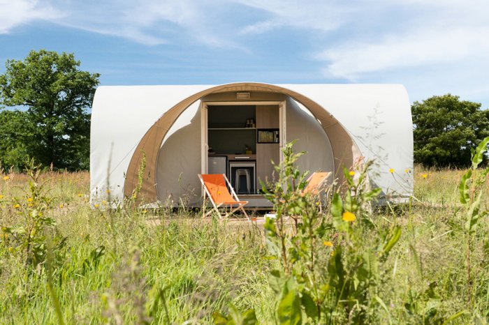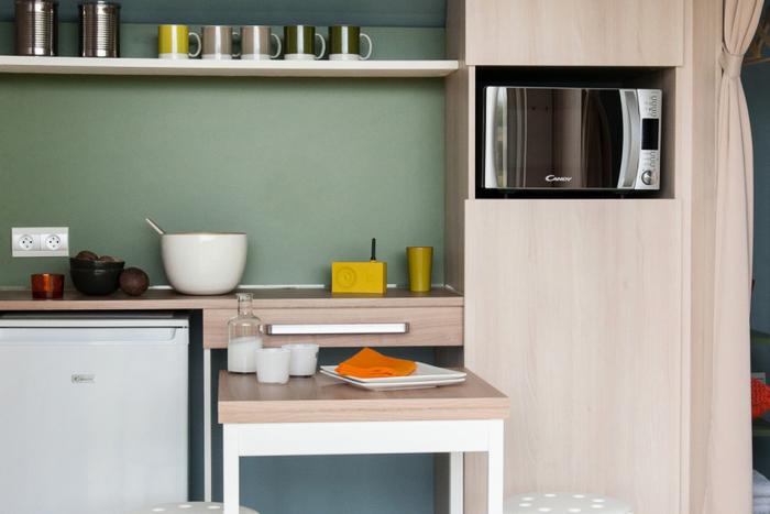 La tente Coco Sweet comprend un coin cuisine équipé avec réfrigérateur, micro-ondes, cafetière, vaisselle.