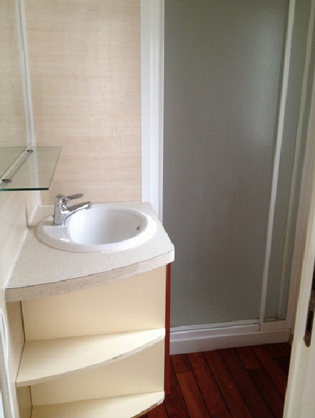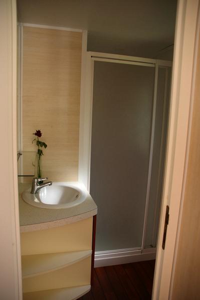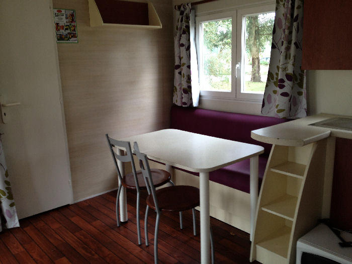 Mobil Home 3 Pièces 5 Personnes de 28m² composé d'un coin repas, d'un coin séjour avec banquette, d'une chambre avec 1 lit double et 1 lit superposé pour enfant de moins de 10 ans , d'une chambre avec 2 lits simples. Terrasse semi-couverte avec salon de jardin, d'une salle de bain et douche.