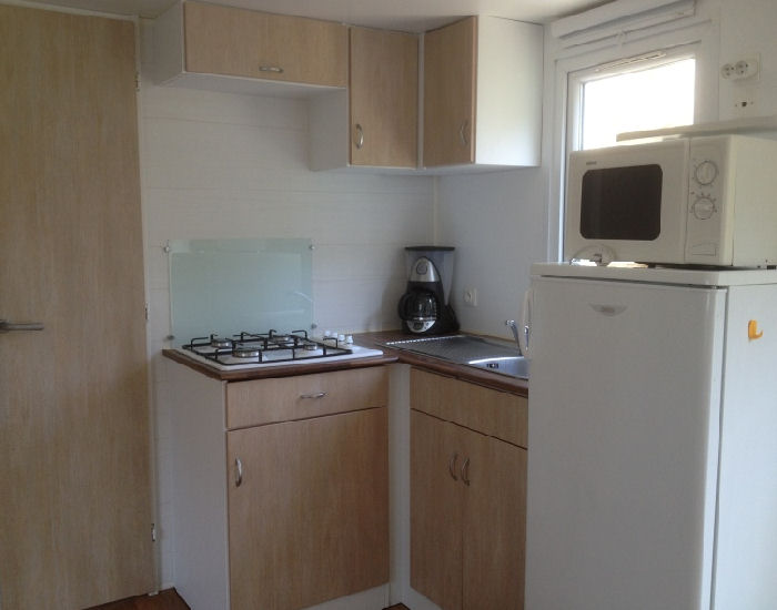 Le mobil home est équipé d'une plaque de cuisson 4 feux gaz, d'un réfrigérateur, d'un micro-ondes, d'une cafetière et de tous les ustensiles de cuisine.