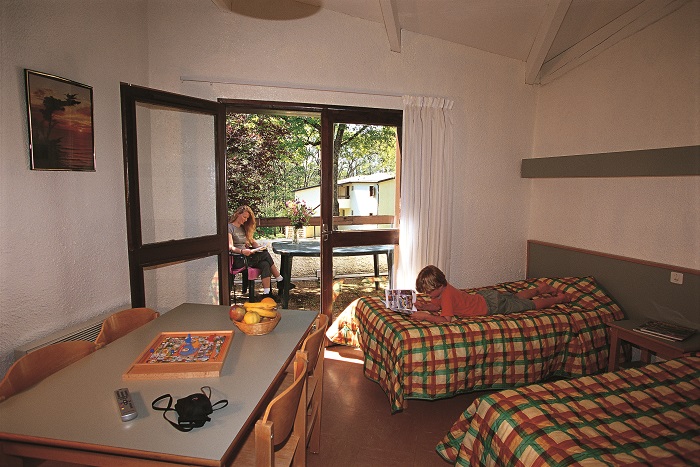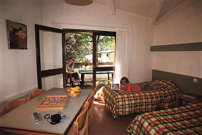 27 m² Séjour-chambre avec canapé-lit (140), espace cuisine Chambre à 2 lits simples (90) ou 2 lits superposés (90) Salle d'eau, WC séparés. Balcon + mobilier de jardin. Bloc d'appartements sur 2 étages avec couloirs extérieurs. Ajout lit bébé possible: séjour (ou chambre si les lits sont superposés).