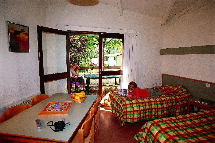 Pour avoir plus de détails et réserver cet hébergement, choisissez une date ci-dessus et cliquez sur voir l'offre ! Vous serez redirigé vers le site proposant la location.27 m² Séjour-chambre avec canapé-lit (140), espace cuisine Chambre à 2 lits simples (90) ou 2 lits superposés (90) Salle d'eau, WC séparés Terrasse + mobilier de jardin Ajout lit bébé impossible : séjour ( ou chambre si les lits sont superposés)
