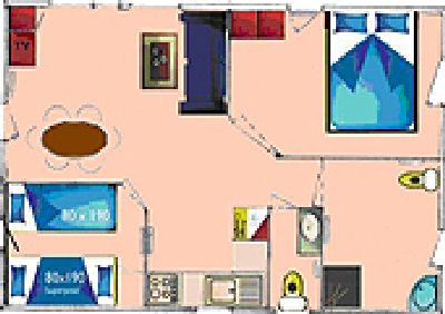 28 m2 de surface nombre de chambres : 2 1 Chambre avec 1 Lit double 1 Chambre avec 2 Lits simples et 1 Lit(s) superpos?(s) Kitchenette ?quip?e nombre de salles de douche : 1 nombre de WC s?par?s : 1 Terrasse T?l?vision Plaques gaz Micro-ondes R?frig?rateur Cong?lateur Cafeti?re Grille pain Barbecue Salon de jardin