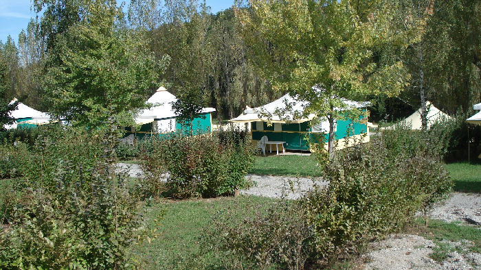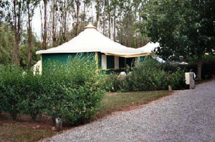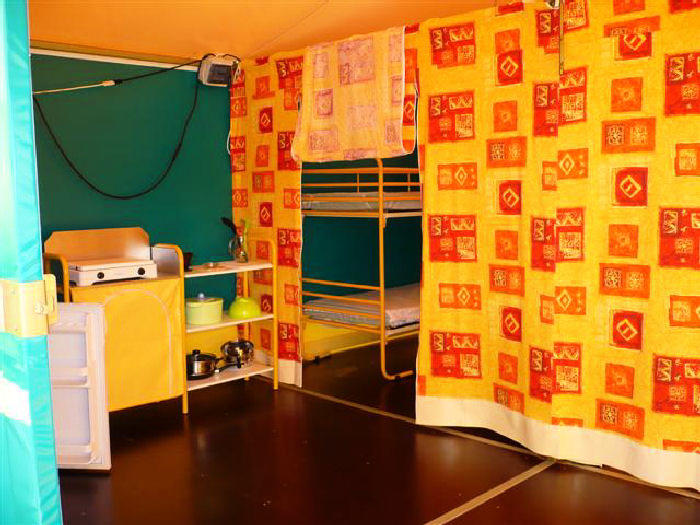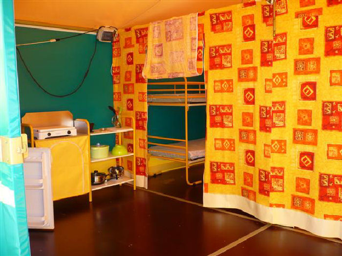 Bungalow toilé de 25m² pour 5 personnes, composé d'une ossature et d'un plancher en bois et d'une épaisse tente en toile, comprenant un espace cuisine équipé, un espace nuit avec "côté parent" 2 lits simples et "côté enfant" 2 lits superposés et un lit simple. A noter : le bungalow toilé ne possède pas d'évier ni de sanitaires, accès libre au bloc sanitaires du camping.