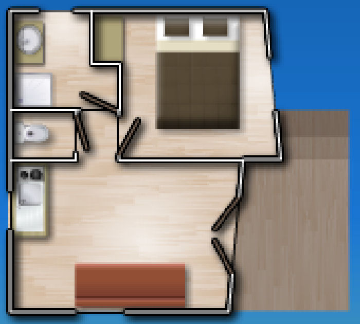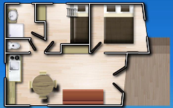 Chalet confort 2/4 personnes de 20m² avec terrasse. Il est composé d'une chambre avec un lit double, d'un coin salon avec banquette clic-clac 2 personnes, d'une kitchenette équipée, d'une salle d'eau avec lavabo, douche et WC séparés. Terrasse avec salon de jardin et parasol.