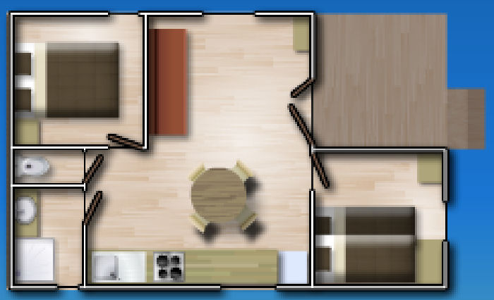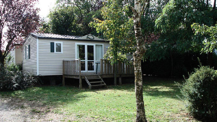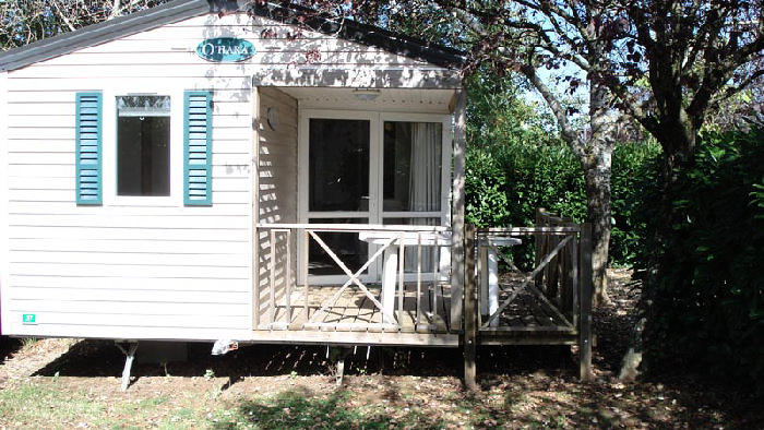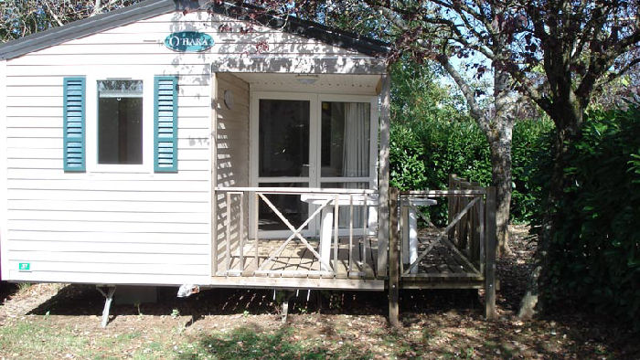 Mobil-home de 30m² pour 4/6 personnes, composé d'une kitchenette équipée, d'un séjour avec un clic-clac pour 2 personnes, d'une chambre avec un lit double, d'une chambre avec 2 lits simples, d'une salle de bains avec une douche, d'un WC séparé et une terrasse. Ancienneté : de 1 à 5 ans.