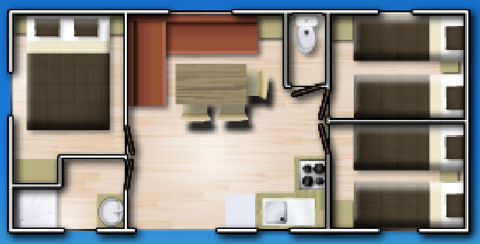 Chalet de 34m² pour 5/7 personnes, composé d'une kitchenette équipée, d'un séjour avec un clic-clac pour 2 personnes, d'une chambre avec un lit double, d'une chambre avec un lit double et un lit simple superposé, d'une salle de bains avec une douche, d'un WC séparé et une terrasse. Ancienneté : de 1 à 5 ans.