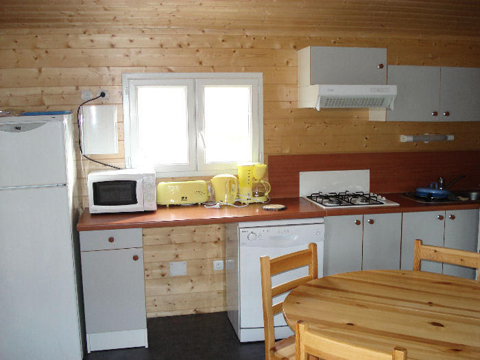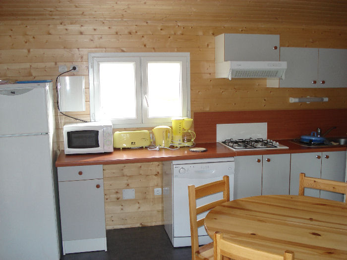 Le chalet comprend une cuisine intégrée avec meubles, évier, 4 feux gaz, 1 réfrigérateur congélateur 217litres, 1 table ronde, chaises et tabourets. La cuisine dispose également d'un lave-vaisselle, d'un micro-ondes, d'une cafetière électrique, d'un grille pain et d'une bouilloire électrique. Les couvertures et les oreillers sont fournis.