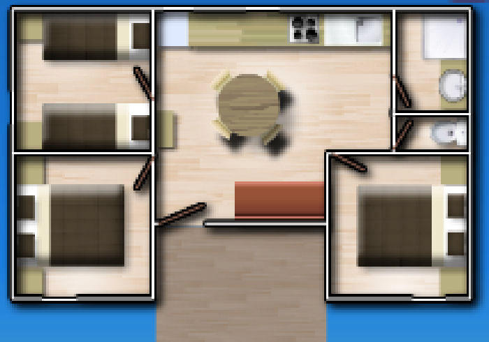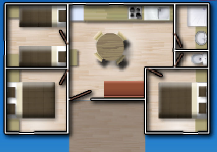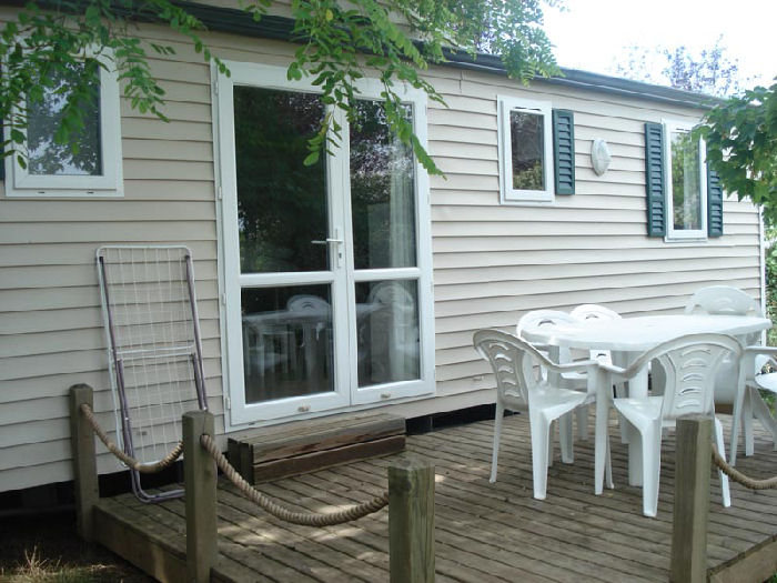 Mobil home de 30m² pour 6/8 personnes, composé d'une kitchenette équipée, d'un séjour avec un clic-clac pour 2 personnes, d'une chambre avec un lit double, de 2 chambres avec 2 lits simples chacune, d'une salle de bains avec une douche, d'un WC séparé et d'une terrasse. Ancienneté : de 1 à 5 ans