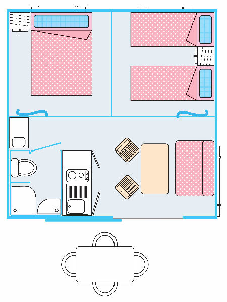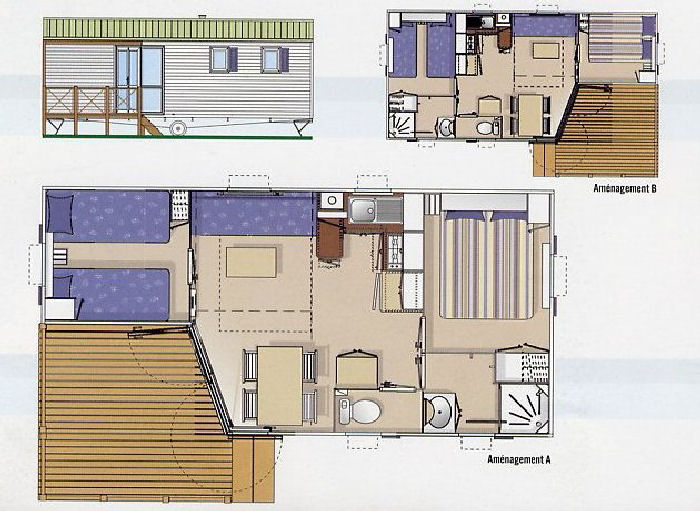 Mobil-home 6/8 personnes de 30m² avec terrasse. Il est composé de 3 chambres (l'une avec 1 lit double, les 2 autres avec 2 lits simples), d'un coin salon avec banquette lit 2 places, d'une kitchenette équipée, d'une salle d'eau avec lavabo, douche WC séparés et d'une terrasse avec salon de jardin et parasol.