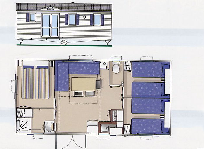 Mobil-home 4/6 personnes de 30m² avec terrasse. Il est composé de 2 chambres (1 lit double et 2 lits simples), d'un coin salon avec banquette lit 2 places, d'une kitchenette équipée, d'une salle d'eau avec lavabo et douche et de WC séparés. Terrasse avec salon de jardin et parasol.