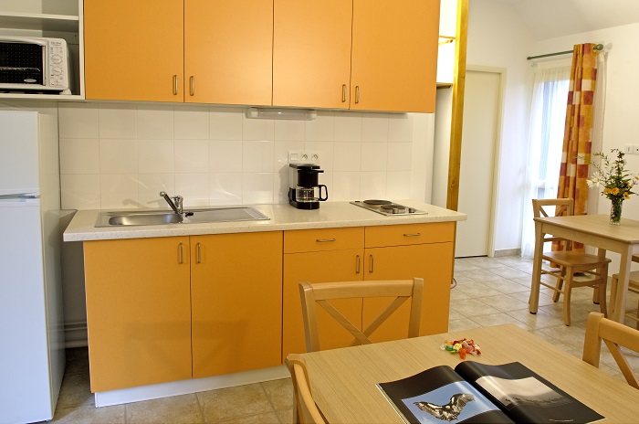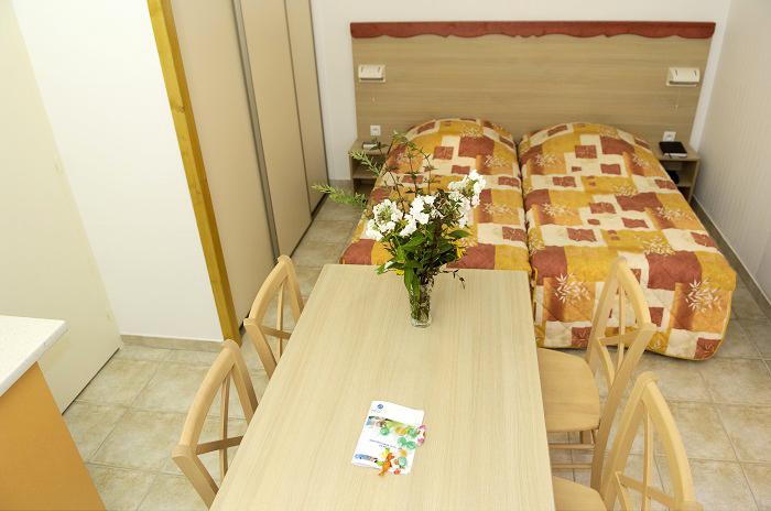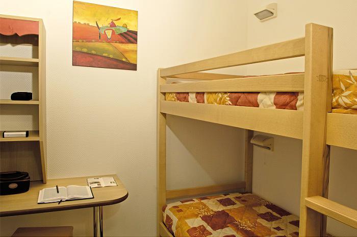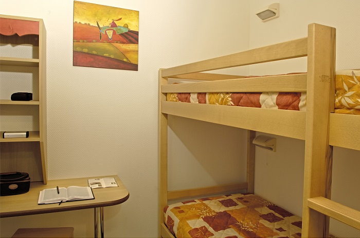 Appartement de 25m² pour 4 personnes composé d'un séjour-chambre avec 2 lits et d'une chambre-cabine avec 2 lits superposés. Kitchenette, salle d'eau (douche, lavabo, WC) et terrasse avec mobilier de jardin.Certains appartements sont adaptés pour les personnes à mobilité réduite.A noter : logement en demi-pension ou pension complète.