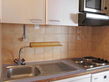 Studio 28 m2 au 4ème étage, aménagement agréable: séjour/chambre à coucher avec 1 divan-lit (140 cm, longueur 190 cm), TV. Sortie sur la terrasse. Chambre avec passage avec 2 lits gigognes (2 pers. 2 x 80 cm, longueur 190 cm). Coin cuisine (four micro-ondes, cafetière électrique, combiné micro-ondes). Bain/WC. Chauffage électrique. Terrasse 10 m2, situation sud, petite terrasse 4 m2, situation nord. Vue sur la mer. A disposition: lave-linge. Place de parking No 7.