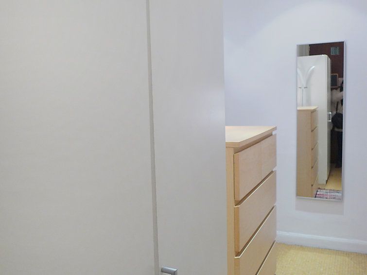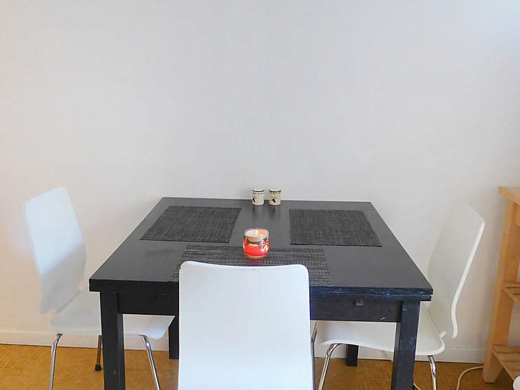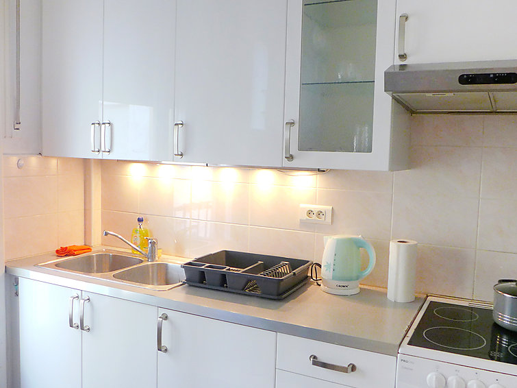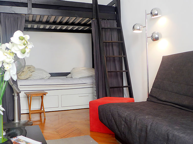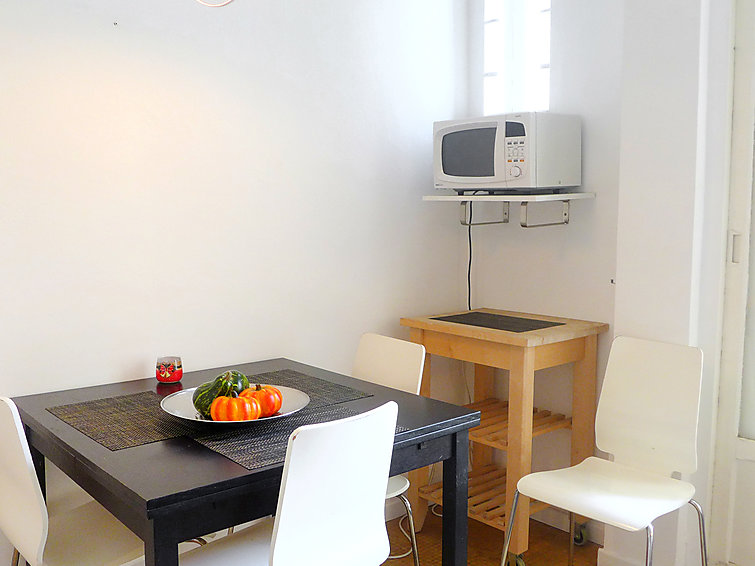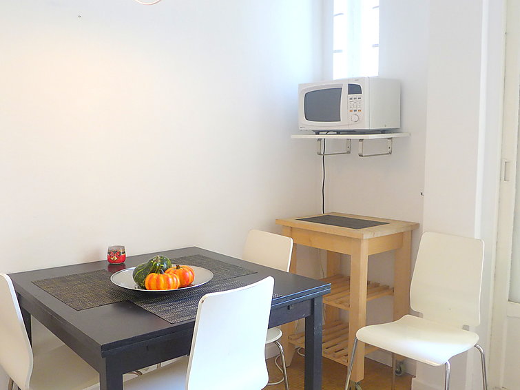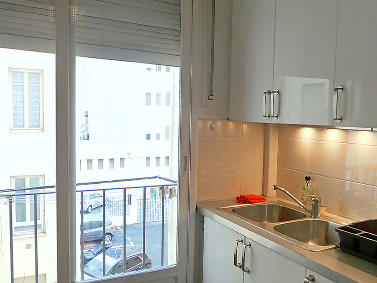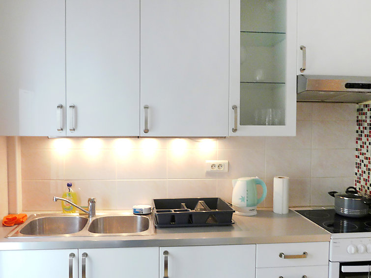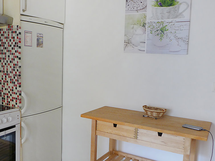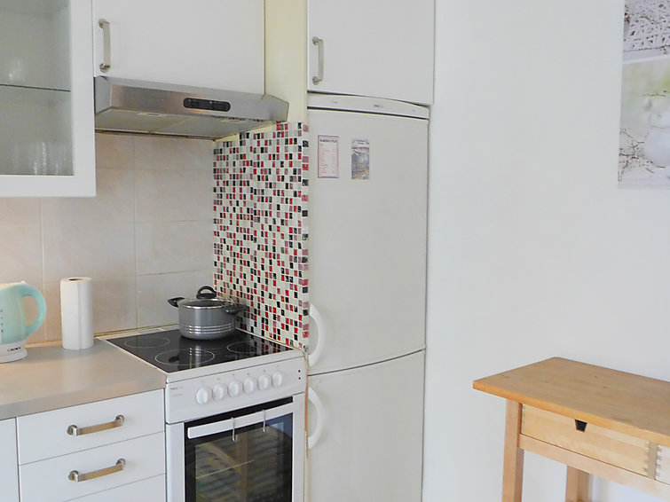 Studio 39 m2 au 2ème étage. Clair, rénové en 2015, aménagement très confortable: Studio avec 1 divan-lit double (1 x 140 cm, longueur 190 cm), 1 x 1 lits superposés (140 cm, longueur 190 cm), table pour les repas et air-conditionné. Sortie sur le balcon. Cuisine (4 plaques de cuisson, four, four micro-ondes, congélateur, cafetière électrique) avec table pour les repas. Douche/WC. Vue sur la ville. A disposition: lave-linge. Veuillez noter: logement côté rue.