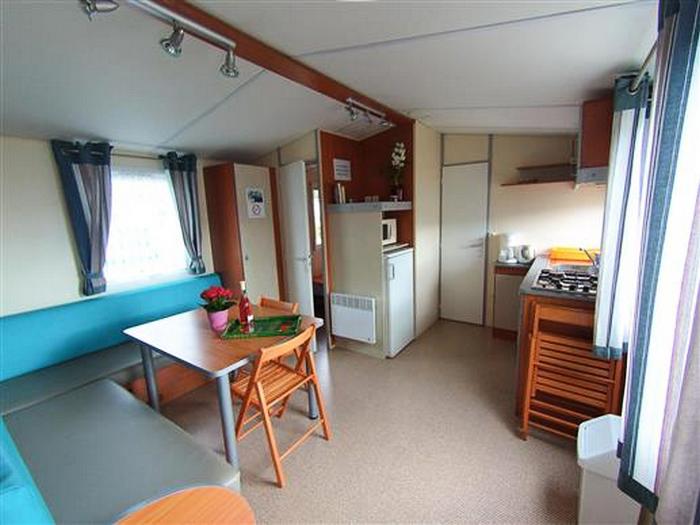 Le Mobil Home comprend une cuisine équipée avec plaque de cuisson, four micro-ondes, cafétière, bouilloire, réfrigérateur/congélateur et vaisselle. Télévision dans le salon. La terrasse est équipée d'un salon de jardin.