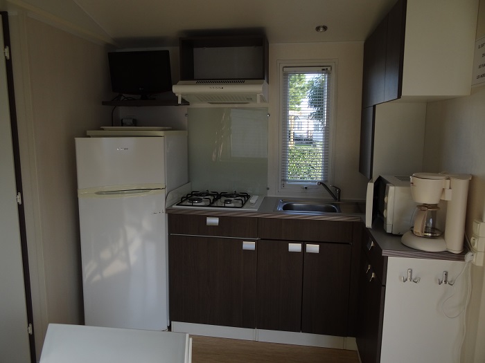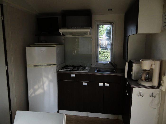 Le Mobil Home comprend une cuisine équipée avec plaque de cuisson, four micro-ondes, cafetière, bouilloire, réfrigérateur/ congélateur et vaisselle. TV dans le salon.