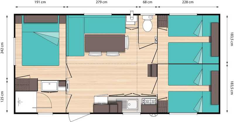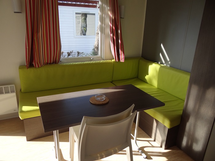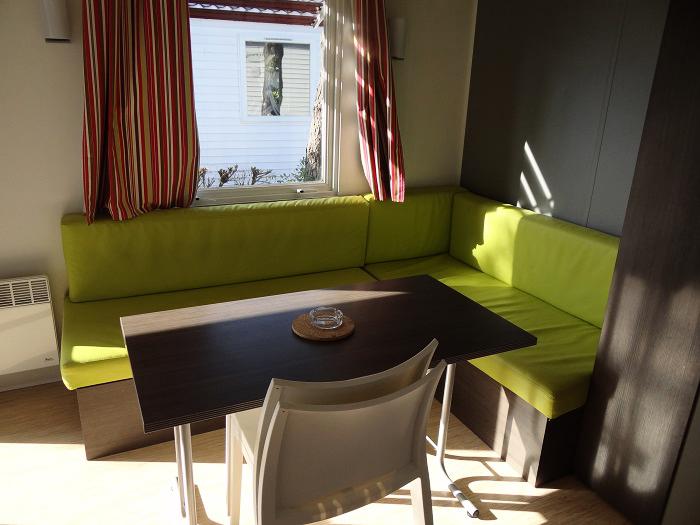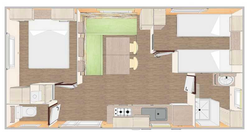 Mobil Home de 31m² 4 Pièces 6 Personnes datant de 2010 composé d'un coin séjour avec banquette, d'un coin cuisine équipé, d'une chambre avec 1 lit double, de deux chambres avec 2 lits simples chacune, d'une salle de douche et de WC séparé. Terrasse semi-couverte. Oreillers et couvertures fournies.