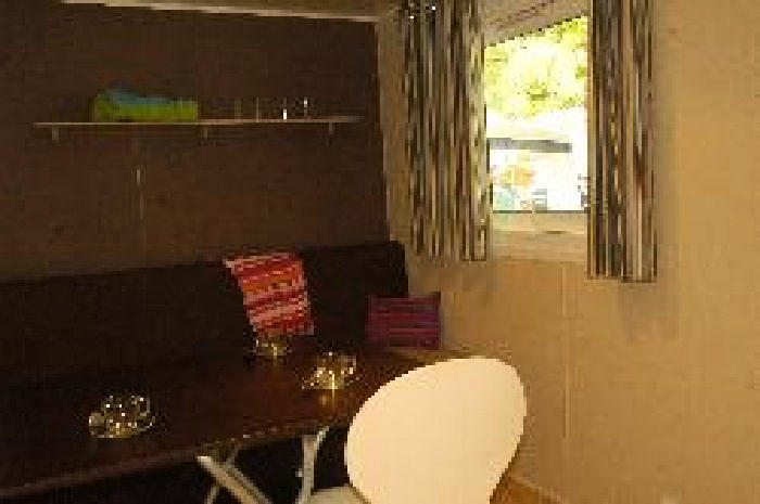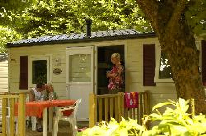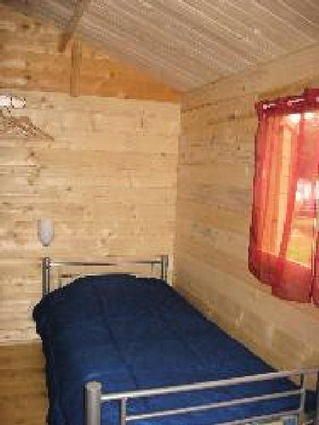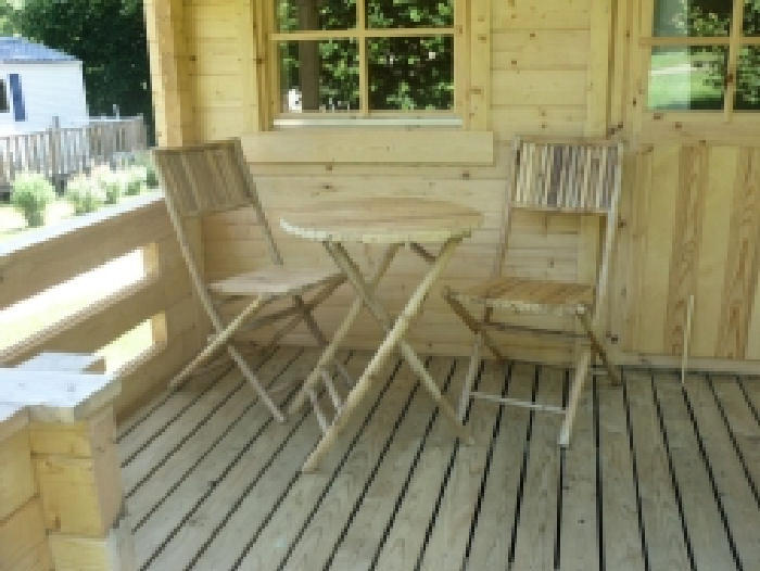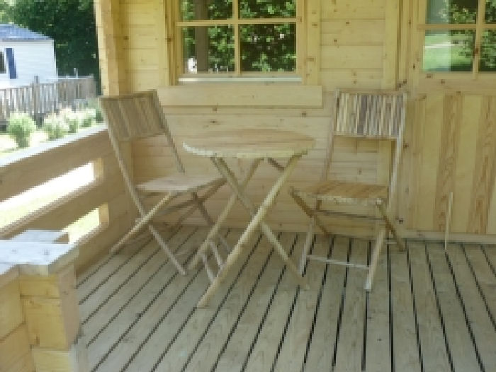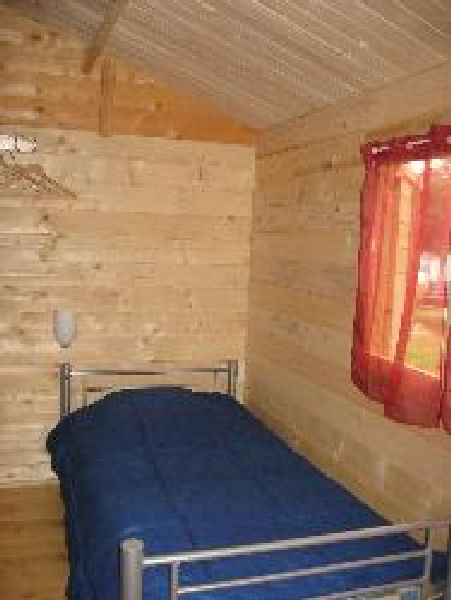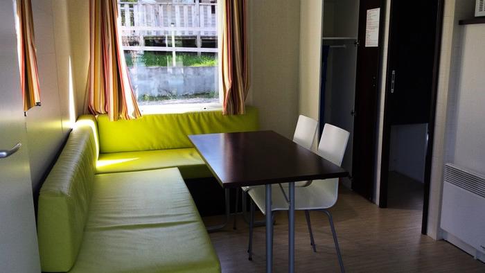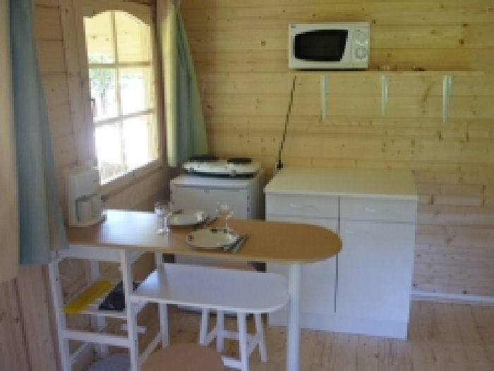 Chalet de 16m² pour 3 personnes, composé d'une kitchenette équipée, d'un séjour avec un coin repas et 3 couchages, et d'une terrasse couverte.A noter : le chalet ne possède pas d'arrivée d'eau (pas d'évier ni de sanitaires), le bloc sanitaires du camping se situe à 2 pas du chalet.